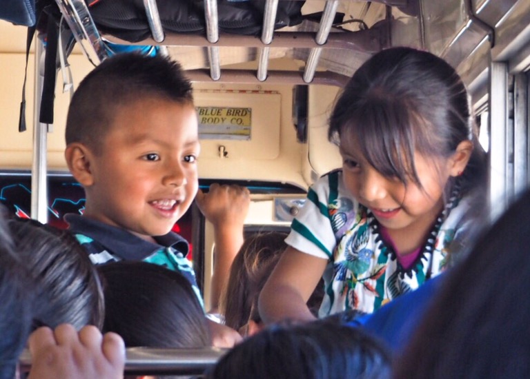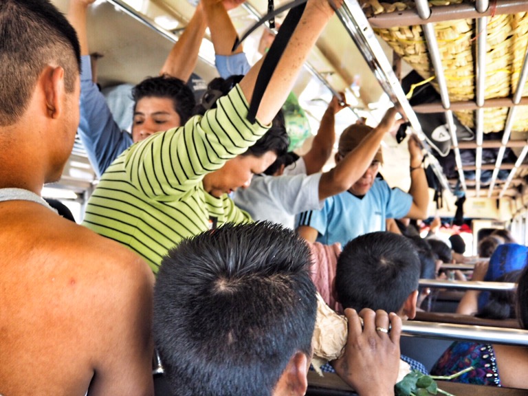 Nach einer Odyssee mit diversen Bussen sind wir am Lago de Atitlan angekommen. Das Busfahren ist etwas spezieller hier. Meistens hat man noch 2-3 Guatemalteken mit auf dem Schoß sitzen. Laute Salsa-Musik dröhnt grell und unaufhaltsam durch die Ohren. Hühner, ganze Inneneinrichtungen und Rucksäcke werden aufs Dach geschmissen und im Inneren die Leute gestapelt. In so einem Chickenbus (was im Prinzip ausgesonderte, umfunktionierte amerikanische Schulbusse sind) passen vielleicht 60 Leute. Hier wird mindestens das 3fache transportiert.