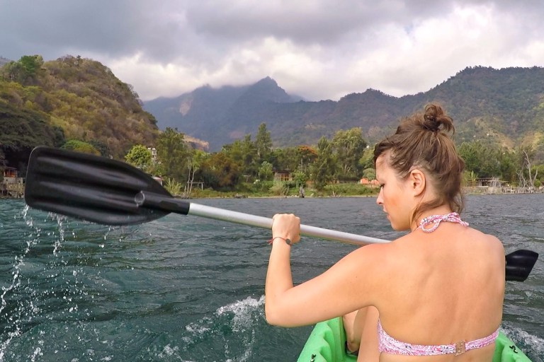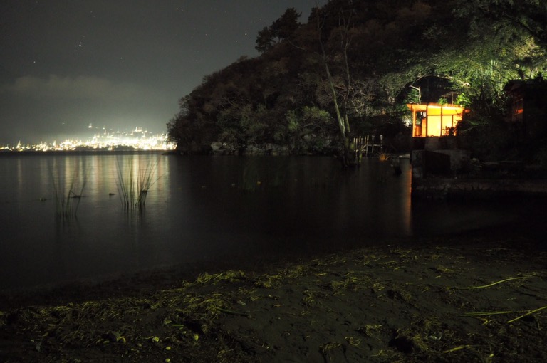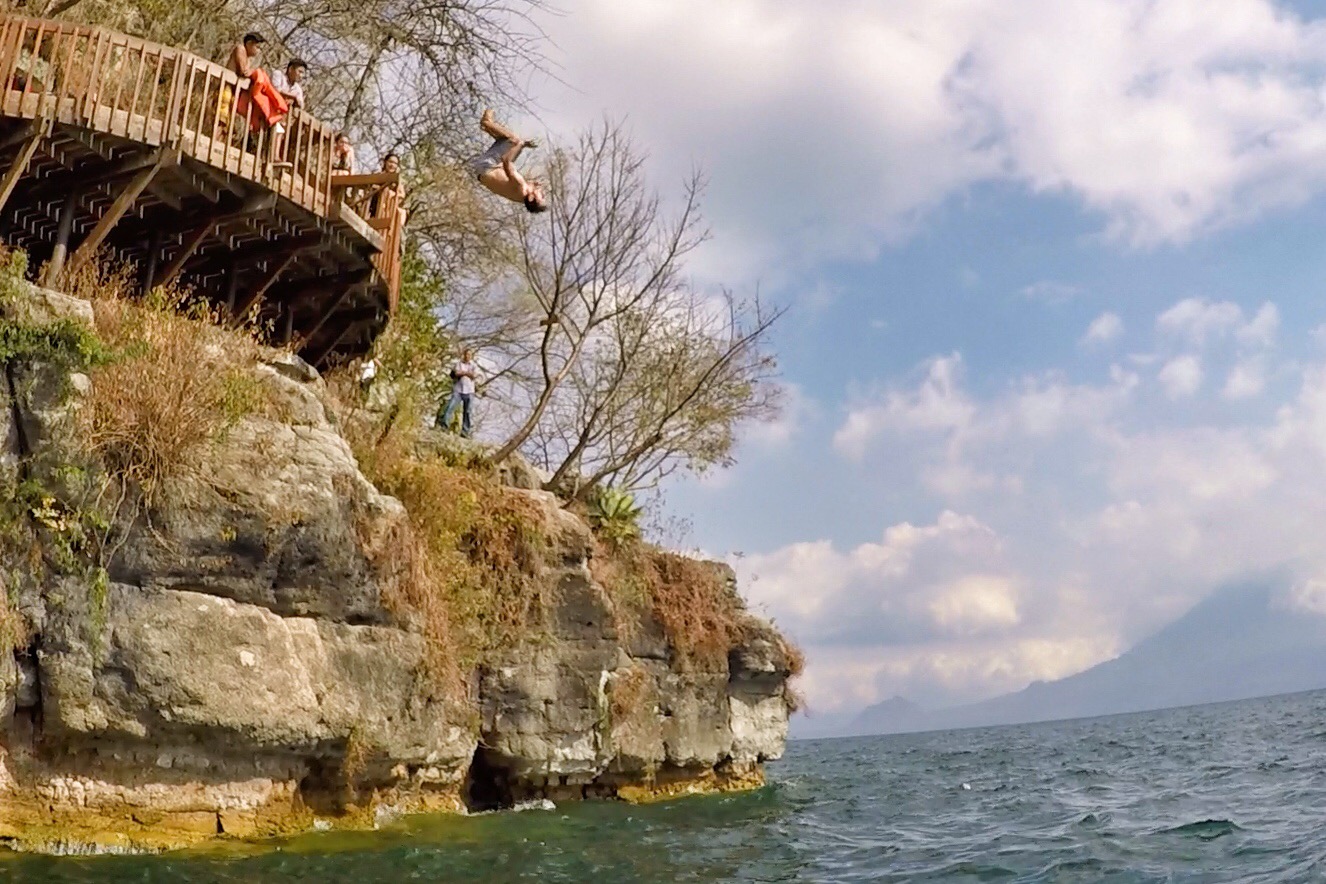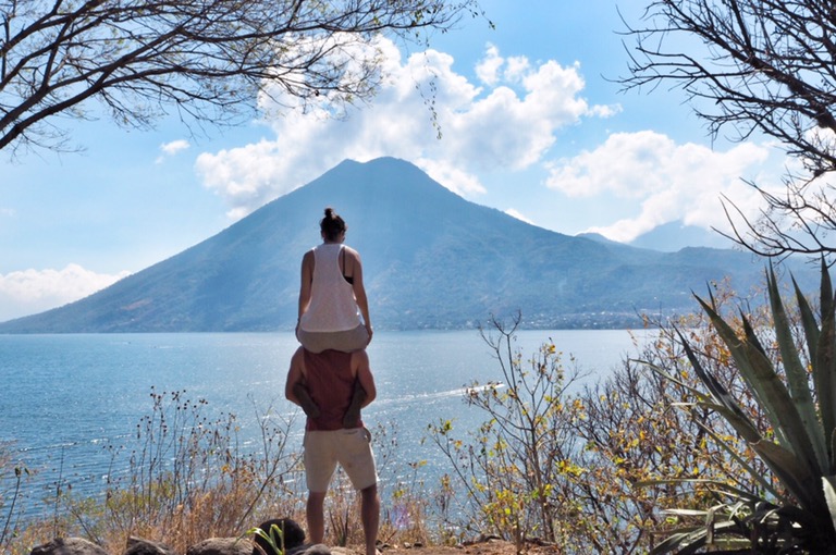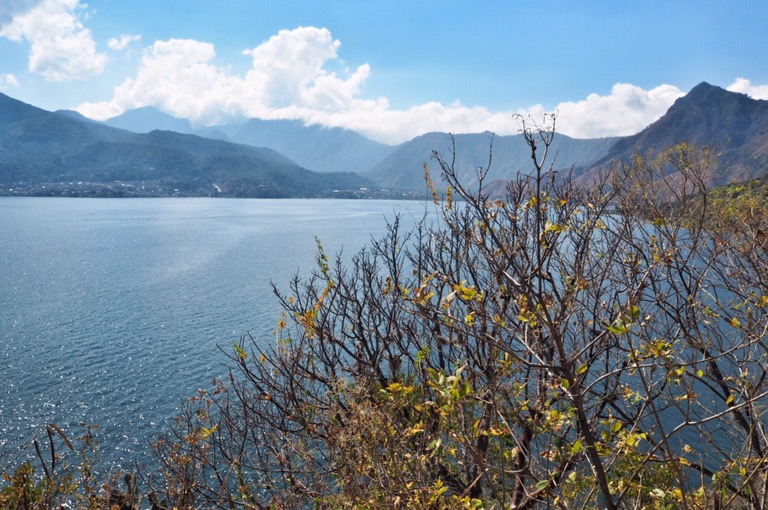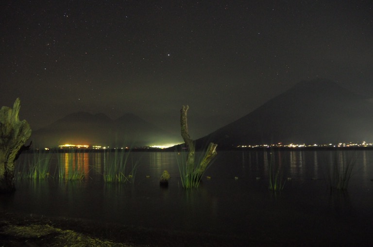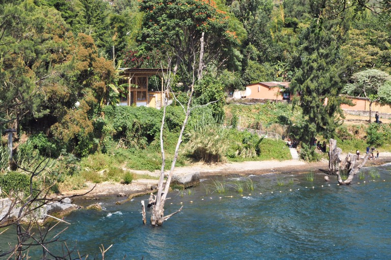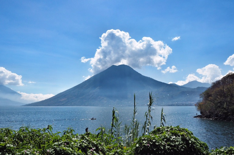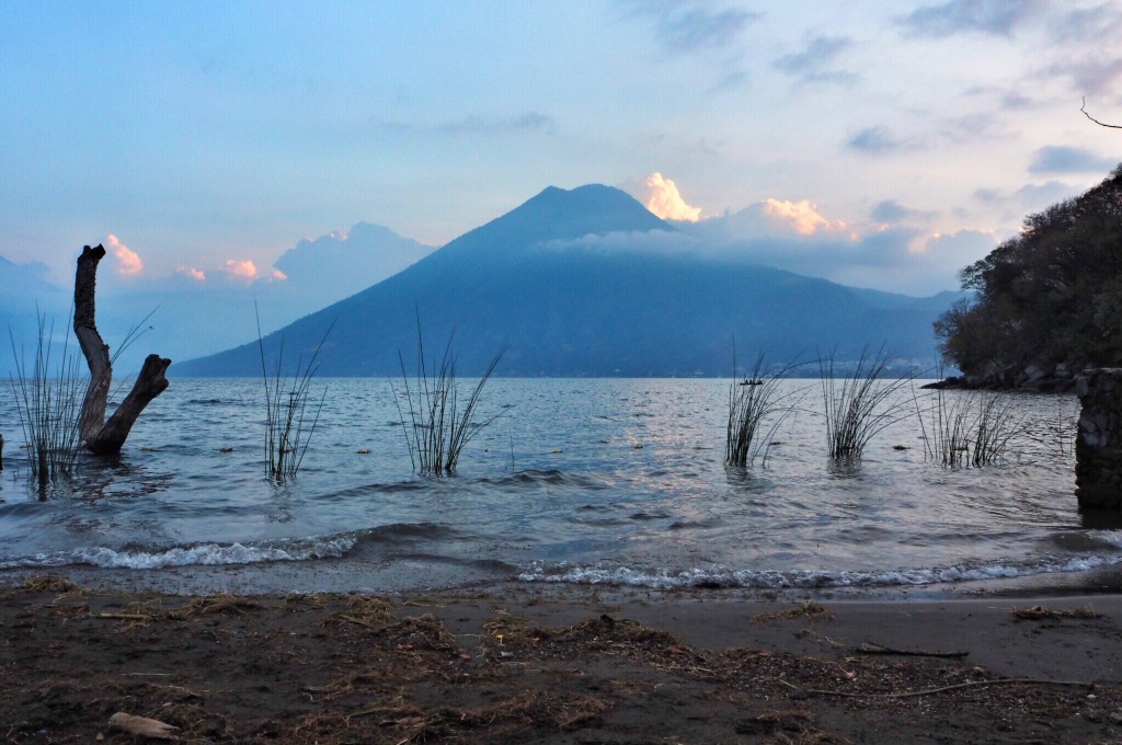 Angekommen, ging es weiter mit dem Boot nach San Marcos. Hier lag uns der See zum ersten Mal zu Füßen: Eine mystische alte Dame. Wo man auch hinsieht, drängen sich majestätische Vulkane in den Vordergrund – eingekesselt von kleinen Villages, die in fruchtbare grüne Hügel abtauchen. Vor Millionen von Jahren ging es mit Vulkanausbrüchen hier richtig zur Sache. Die Aschewolke sah man noch bis nach Florida. Durch den massiven Magmaausstoß ist die Oberfläche des Terrains auseinander gebrochen und hat eine zirkulare Mulde geformt, die sich schnell mit Wasser gefüllt hat: Den 18km breiten Lago de Atitlan.