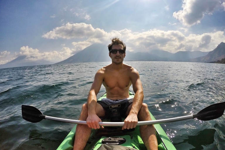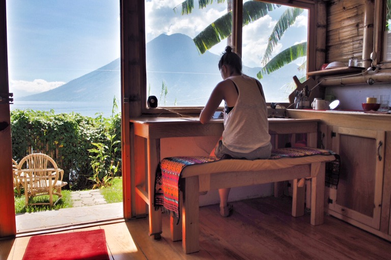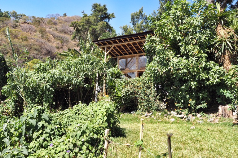 Wir sind hier bei Yehuda untergekommen, ein Palästinenser, der lange in der USA gelebt hat und hier nun sein Aussteigerleben lebt. Wobei ich vermute, dass sein ganzes Leben ein Aussteigerleben war. Er hat sich hier direkt am See eine kleine Off-the-Grid Bambus Cabin mit direktem Zugang zum Strand gebaut. Strom und warmes Wasser bekommen wir durch eine eigene Solaranlage. Das Wasser wird aus dem See geführt, gefiltert und im Silo gespeichert. Es gibt eine Kompost-Toilette und geduscht wird draußen mit einem phenomenalen Blick auf einen der Vulkane. Einen eigenen Bananen- und Avocadobaum haben wir auch. Jackpot!