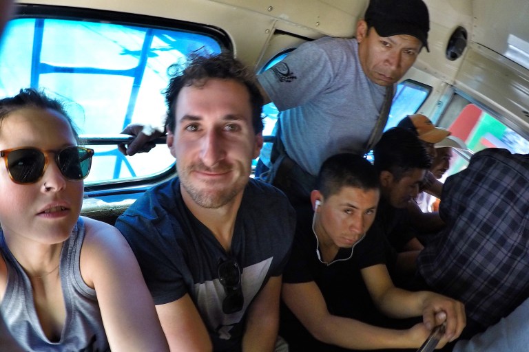 Die Busse fahren von einem größeren Dörfchen zum Nächsten. Dazwischen steigt man um. Was dann als Backpacker ungefähr so aussieht: Es gibt eigentlich keine genauen Haltestellen – zumindest keine für uns sofort erkennbaren. Irgendwo stehen mehrere Menschen an der Straße – ein Indiz. Meistens dauert es nur 2min und der nächste Bus fährt vorbei und ab gehts: Während der Bus eigentlich noch fährt, springt man rauf und alles ist fürchterlich hektisch. Irgendwelche Menschen reißen dir dein Backpack von den Schultern, schmeißen ihn aufs Dach und stapeln dich auf die anderen Leute im Bus. Es geht IMMER noch einer rein. Soviel ist sicher! Dann geht es in einem Mordstempo und unter Missachtung jeglicher Verkehrsrichtlinien durch die Serpentinen. In dem Kurven hängt man am Ohr des Anderen bis man in der nächsten Kurve zum nächsten Ohr geworfen wird. Was ungemütlich und stressig klingt, ist eine grandiose Erfahrung, um mit Locals in Kontakt zu kommen. Und wirklich: Auch mit dem erbärmlichen Spanisch und unseren 2 Händen kann man viel erreichen. Alle helfen gern, haben ein Lächeln über oder sogar einen kleinen Schnack.