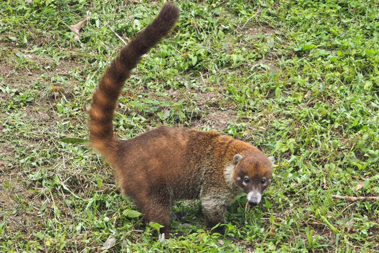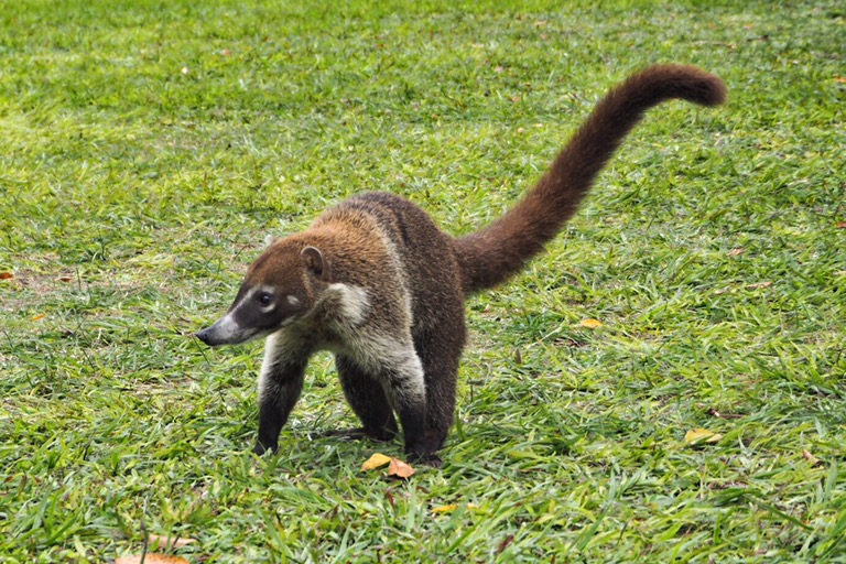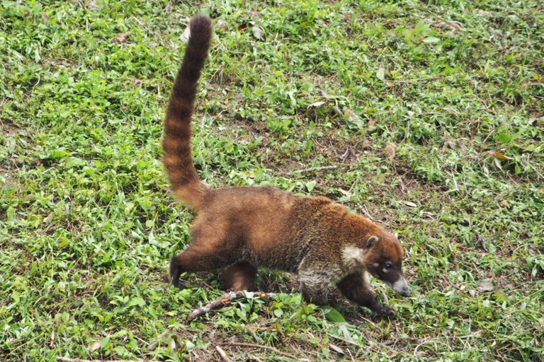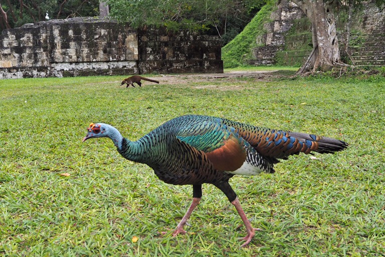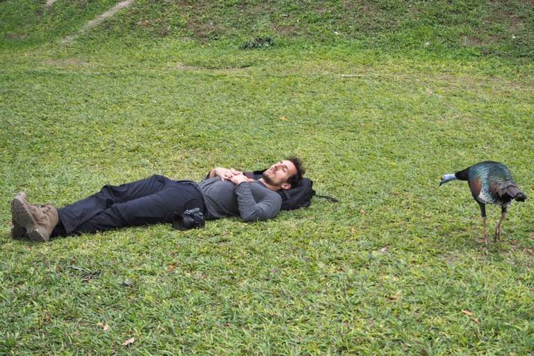 Mittags – immer noch wacklig auf den Beinen und völlig benommen von der Nacht – haben wir uns tief in die Augen geschaut: Wir sind den weiten Weg extra in den Norden gefahren, um Tikal zu sehen und jetzt soll alles umsonst gewesen sein? Nein! Ein Dorfbewohner hat uns freundlicherweise ins ca. 1h entfernte Tikal gefahren, da keine Collectivos mehr unterwegs waren. Und da waren wir nun: Völlig erschöpft, definitiv nicht fähig das ganze Gelände abzuarbeiten – aber in einer glanzvoll surrealen Atmosphäre. Wir schleppten uns an ein paar alten Steinen vorbei Richtung Gran Plaza – das Zentrum Tikals. Hier verweilten wir 3h – schliefen, staunten, jubelten merkwürdigen truthahnähnlichen Gefieder mit bunten Pusteln, Affen und Nasenbären zu. Ich habe ein neues Lieblingstier! Wie geil sind bitte Nasenbären?!
