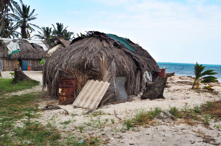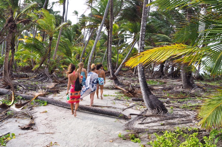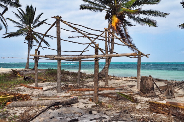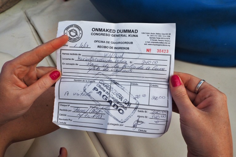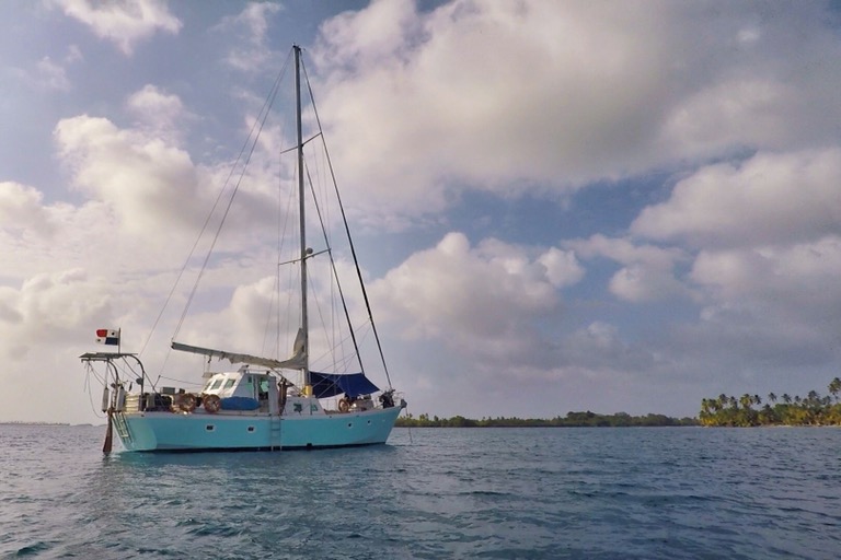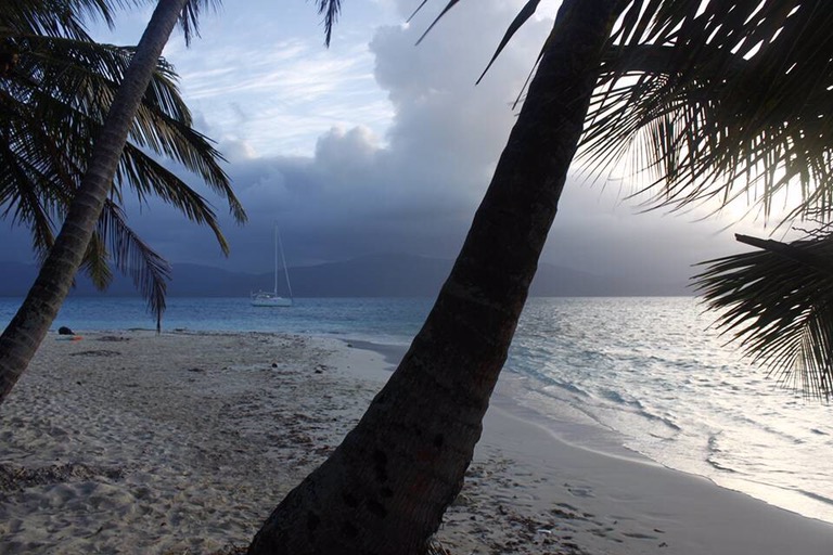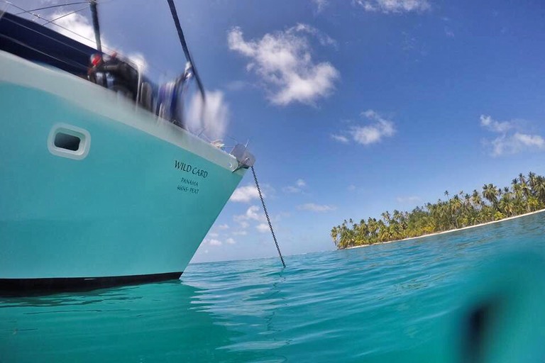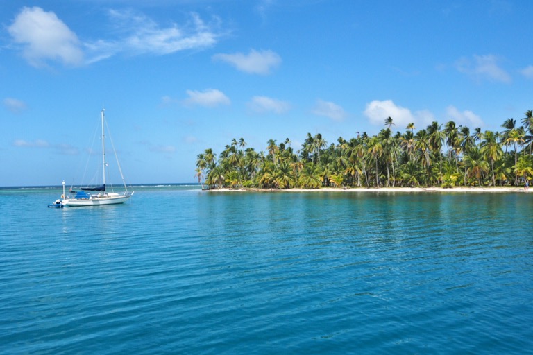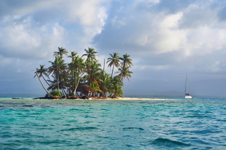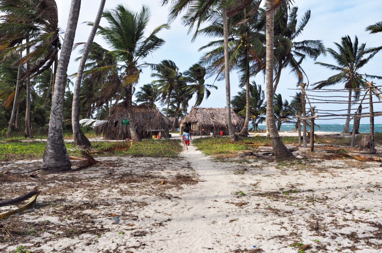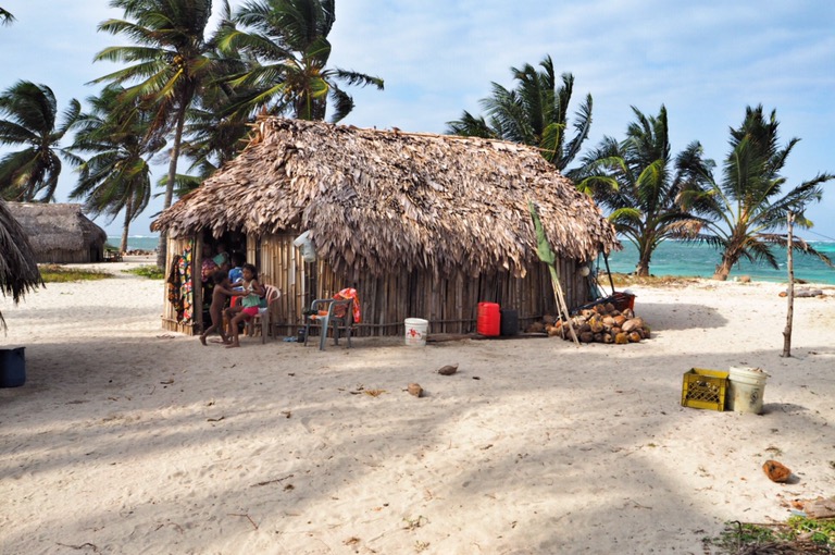 Unsere Ablegestelle Portobello ist ein kleines Hafendorf, in dessen Bucht jede Menge Bootsleichen im Wasser treiben. Teilweise sieht man nur noch bemitleidenswert den Mast und ein zerfetztes Segel aus dem Wasser ragen. Als wir am Dock auf unser Boot gewartet haben, sind wir durch Zufall in eine kleine BBQ-Party von ein paar Einheimischen gestolpert. Hier wurden wir mit reichlich Bier und Hähnchenschenkel gefüttert und spontan zum Salsa-Tanz aufgefordert. Pünktlich zum Sonnenuntergang haben wir abgelegt. Von Portobello war es eine Nacht Fahrt auf offener See zu den San Blas Inseln: 374 kleine Inseln, manche nur so groß wie meine Küche – bewohnt von einer Kokospalme. Die Inselgruppe ist eine autonome Region von Panama – besiedelt von einem indigenen Volk, den Kunas. Diese dürfen das Gebiet unabhängig vom Staat Panama verwalten. Hier gelten ihre Gesetze und Auflagen. Das hält glücklicherweise die Tennissockenträger mit Rollkoffer fern, sodass Tourismus in seiner abstoßenden Form hier nicht existieren kann. Will man die Inseln als Reisender besuchen, braucht man die Genehmigung der Kunas und muss eine entsprechende Tax zahlen. Will man auf einer der Inseln übernachten, bieten die Kunas einen Schlafplatz in einem ihrer aus Palmen gebauten Hütten an. Hotels oder andere Gebäude gibt es nicht.