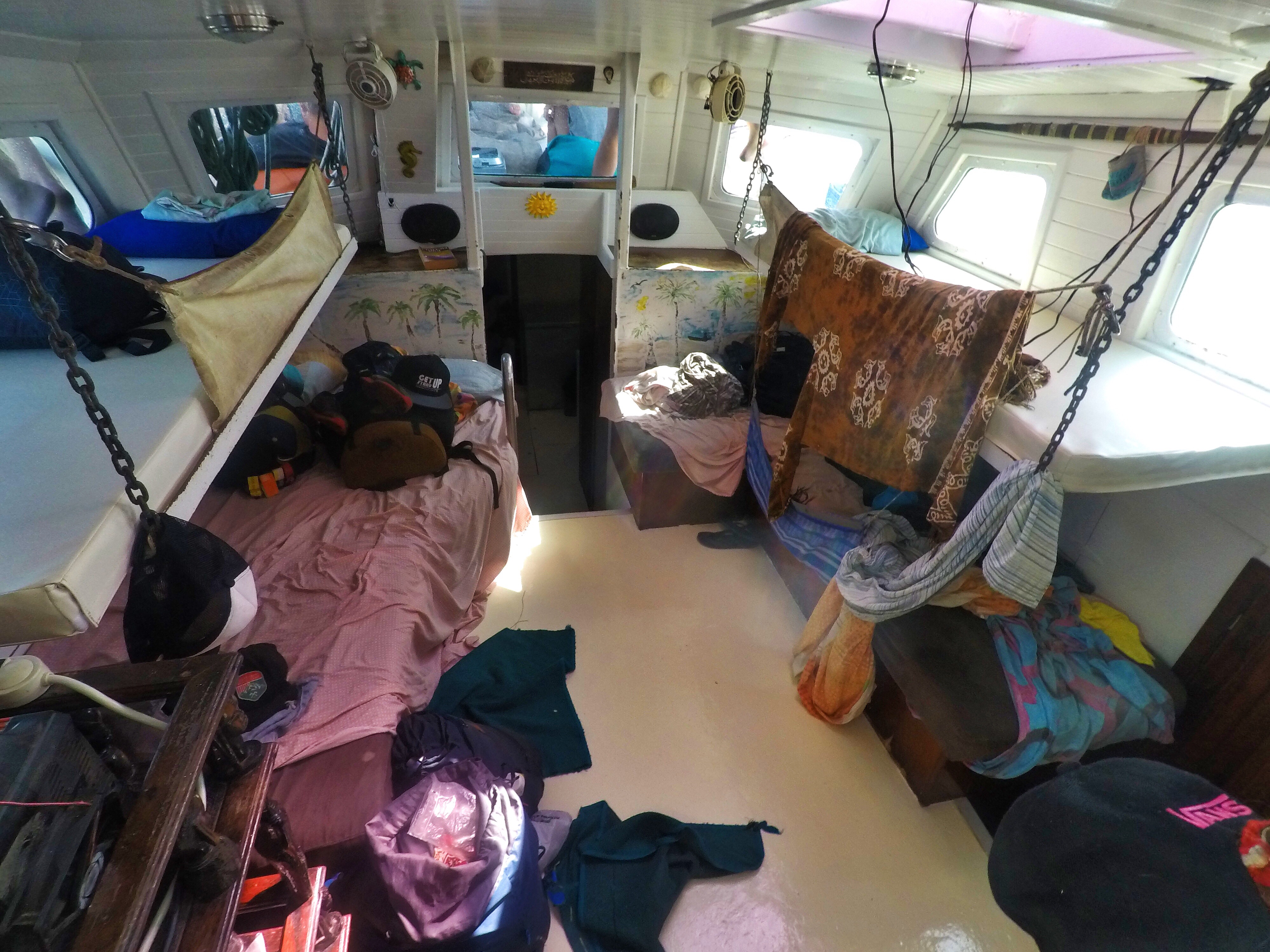 Eigentlich wollten wir alle die erste Nacht auf Deck schlafen: Hier gab es Sterne und frische Luft satt. Beides konnten wir gut gebrauchen. Da die See aber immer rauer wurde und das Wasser bereits überschwappte, flüchteten wir kurzerhand unter Deck. Hier war die Fahrt nur im Liegen ertragbar, denn alle Gesetze der Schwerkraft wurden außer Kraft gesetzt. Das verwirrt den Körper und setzt ihn massiv unter Stress. Allein der Gag zur Toilette hatte die Qualität eines 2000 Meter-Hindernislauf. Rumsbums. Überall einmal hart angedockt, aufgeschürft und langgerutscht, verlor man die völlige Kontrolle über Körper und Sinne. So müssen sich Tiertransporte anfühlen. Ich hatte meine Sachen anfangs in meine Koje aufs Bett geschmissen. Dabei blieb es auch. Es war mir nicht mehr möglich irgendwas wegzuräumen, geschweige denn Ordnung zu schaffen. So habe ich einen unruhigen Achterbahnschlaf neben und unter Äpfeln, Chips, Wasserflaschen, Orangen und Klamotten verbracht. Ich bin glücklicherweise nicht seekrank geworden, aber 1/3 von uns hat es richtig erwischt.