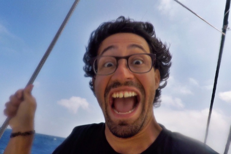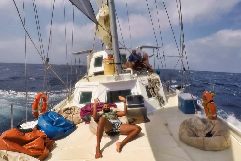 Und dann kam schließlich der Abend: Die See ist merklich rauer geworden, der Wind hat deutlich Fahrt aufgenommen. Ich werde den einen Moment wohl nie vergessen: Ich stand mit Stina und Matt auf der rechten Seite des Hecks – David und Keanen auf der linken Seite – als sich plötzlich das Boot aus seiner 45Grad-Dauerpose zum Wasser löste und sich auf meiner Seite völlig aus dem Wasser hob. Verwirrt und teilweise panisch griffen wir nach der nächsten Möglichkeit zum Festkrallen. Ich weiß noch, dass Stina irgendwas vom Kilimandscharo erzählte als mein Blick nach rechts schweifte und ich in den Schlund einer riesigen Welle sah, die drei Meter über unsere Köpfe auf uns niederprallte. Der Rumpf des Bootes lag ein paar Millisekunden fast mit 75Grad zum Wasser, in dem David und Keanen bereits schwammen – nur noch von der Reling geschützt. Danach mussten wir unverzüglich das Deck verlassen. Die Show ging jetzt erst richtig los! Die Wellen wurden immer unregelmäßiger, heftiger und größer. Ein Sturm zog auf. Unter Deck sind die Leute hin- und hergeflogen. Die ganze Küche wurde einmal zerlegt, ein Fenster ist kaputtgegangen, Türen beschädigt, Wasser ist eingetreten, Stromausfall. Auf Deck sind Sitze und Rettungsringe über Bord gegangen. Unter Deck konnte man nur noch in liegender Position unbescholten bleiben. Und selbst diese war kaum auszuhalten. Da ich meine Koje direkt am Bug hatte, lag ich eigentlich die ganze Nacht in totaler Schieflage unter Wasser im 90Grad-Winkel zu meinem eigentlichen Bett auf der Holzverkleidung. Liegen ist an der Stelle auch der falsche Ausdruck. Ich wurde eigentlich kontinuierlich durchs Bett geschleudert. Es gab ein Punkt, an dem ich mir nicht sicher war, ob wir diese Nacht auf dem Atlantik überleben werden. Am nächsten Morgen hat sich die Situation entschärft, keiner hat ein Auge zugekriegt, alle haben sich nur fragend mit einem schockierten “What the fuck?!” angeschaut. Charly, unser erfahrener Captain, hat uns später noch gesteckt, dass diese Nacht seine Härteste auf dieser Route war. Das war auf jeden Fall eines der berüchtigten “Once-In-A-Lifetime”-Erlebnisse, von dem jeder spricht.
