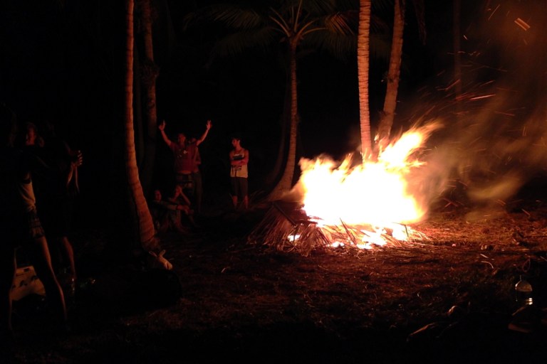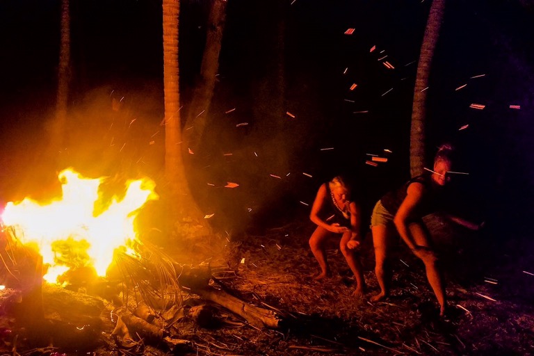 Abends haben wir uns spontan auf einer “größeren” unbewohnten Insel niedergelassen und ein so riesiges Feuer gemacht, da wäre Grisu, der kleine Drache, vor Neid erblasst. Ich weiß nicht, ob es die hohen Flammen oder der starke Rum war, aber irgendwas hat die Gruppe in Brand gesetzt. Nach kürzester Zeit war die Rauschamplitude am Ausschlagen und jeder enthemmt. Das Verhalten auf Rum stand im völligen Missverhältnis zum Alltagshandeln. Viele hatten das Bedürfnis sich nackt auszuziehen und ins Meer zu springen, es wurde wild um’s Feuer getanzt, gegröllt, gesungen. Was für eine Party! Und die ganze Insel nur für uns! Am Ende war es so skurril, dass ich oft mit geöffneten Mund dastand und staunte, in welchen ekzessiven Bahnen die Truppe abgebogen ist. Warum? Weil ich nüchtern war. Seit dem Aufstehen musste ich neben meiner elektronischen Selbstzerstörung auch gegen eine Erkältung ankämpfen. Wie zum Teufel kann man sich im Paradies bei 36grad erkälten?! Ich war sehr in Sorge, dass ich mir Malaria in Honduras eingefangen hatte und es jetzt richtig lustig wird. Malaria hat eine Inkubationszeit von 15 Tagen, die war genau jetzt abgelaufen. Dabei startet die Malaria-Show genau mit: Einer Erkältung und Fieber. Auf letzteres habe ich jeden Moment gewartet, das es eintritt. Es ist, als wenn man auf dem Bahnsteig steht und ungeduldig auf einen verspäteten ICE nach Irgendwo wartet, um in Irgendwo noch zu Irgendwas halbwegs pünktlich zu erscheinen – Nur nicht ganz so hoffnungsvoll. Daher gab es für mich in diesem Fall nur Aqua Libré.